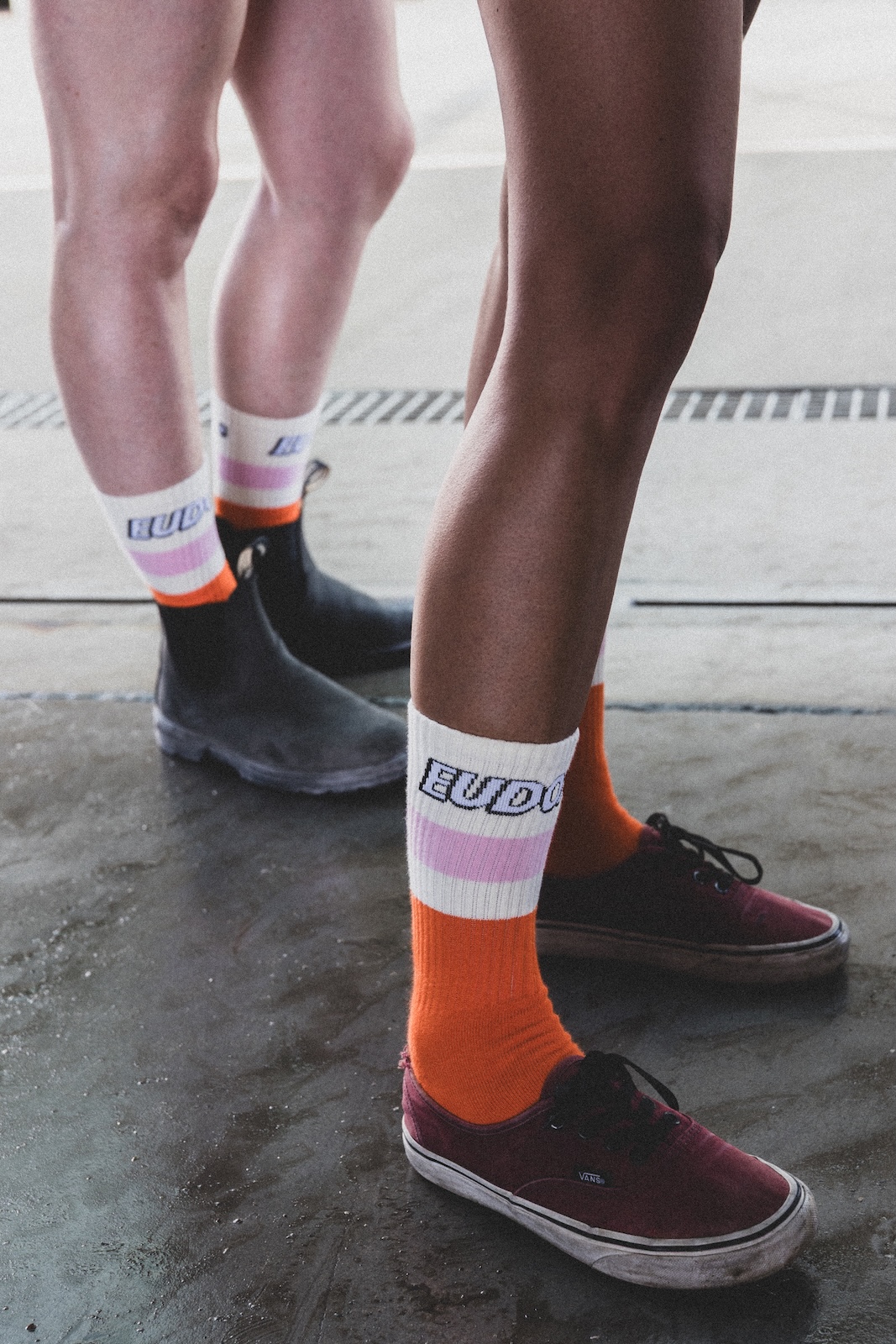 On a misé sur la couleur, le confort, et ce petit twist qui fait la différence. Orange punchy au pied, deux bandes crème, une bande rose un peu plus haut — et le tout dans une coupe mi-mollet bien calée. Elles claquent juste ce qu’il faut, sans en faire trop.