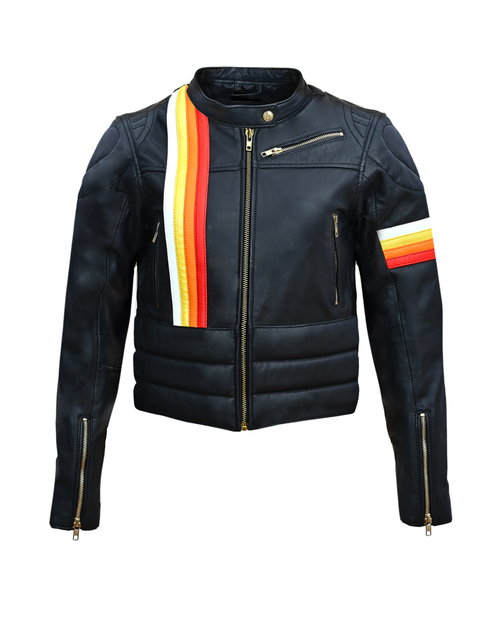 Affirmez votre style sur la route avec la veste Mona Sunrise, une pièce audacieuse qui allie allure sportive et esprit moto. Conçue pour les rideuses en quête d’un look unique, cette veste en cuir noir est sublimée par des bandes de couleurs vives – blanc, jaune, orange et rouge – qui dynamisent son design. Son caractère affirmé et ses finitions premium en font un incontournable pour toutes celles qui veulent rouler avec style.